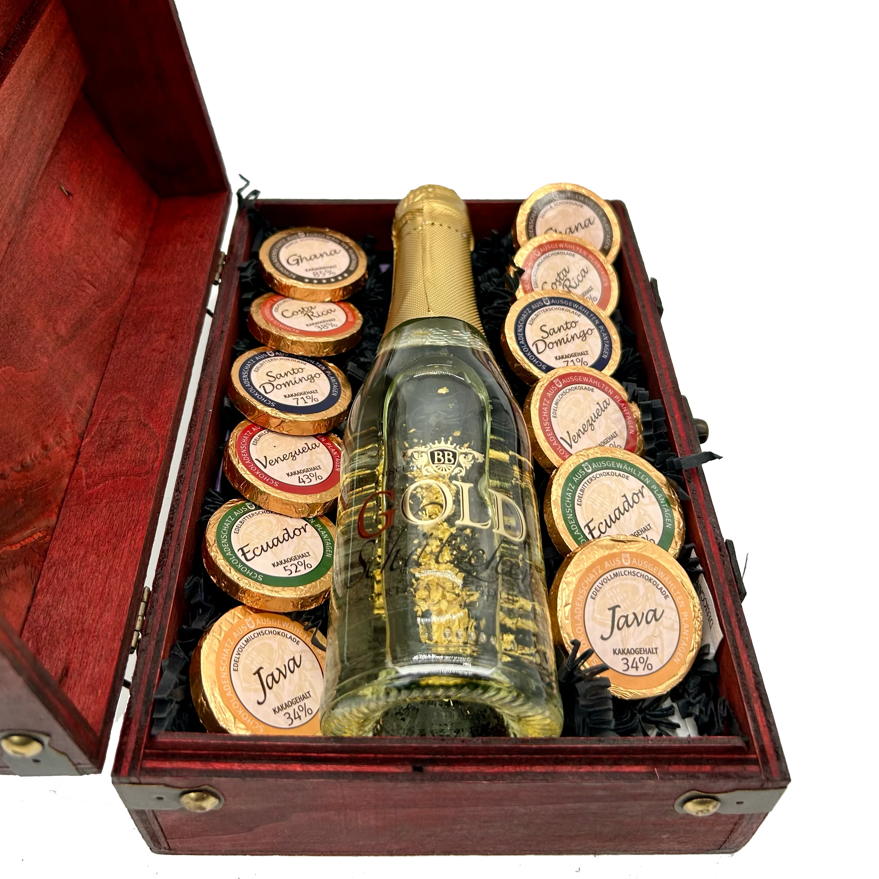 Wenn Menschen unbezahlbar sind, verdienen sie ein Präsent, das funkelt. Diese edle Holztruhe birgt einen wahren Schatz – prickelnden Sekt mit 22 Karat Blattgold-Partikeln und zwölf feinste Schokoladen-Dublonen, die jeden Moment vergolden. Ob für die beste Freundin, Ihre Mutter oder geschätzte Kollegen – dieses Präsent zeigt echte Wertschätzung.